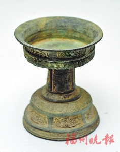“豆”在古代是食肉器,形似高足盘。福州市博物馆馆收藏的铜“豆”高18.2厘米、口径16厘米、底径15厘米,重1.92千克,由承盘、柄和圈足底座三部分组成。承盘敞口外撇、浅直腹、平底,圆柱形柄,下接喇叭形圈足。承盘外壁饰开光缠枝莲纹,下部饰一周二方连续式雷纹。柄的上、下部各饰一周二方连续式雷纹,中部饰缠枝莲纹。圈足自上而下以两组宽弦纹间隔,饰如意云纹、开光缠枝莲纹和覆莲瓣纹。