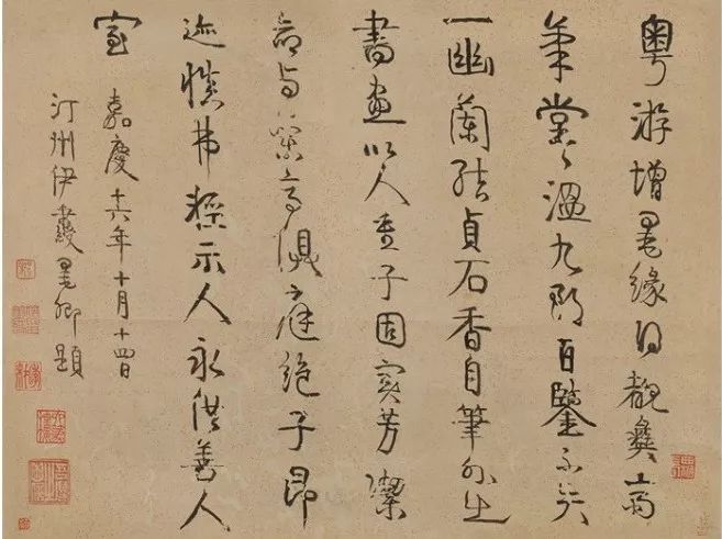 除隶书外,伊秉绶的行书亦戛戛独造,独树一帜。其行书受到了二王、颜真卿、李东阳、刘墉书法的影响,尤其善于把颜真卿的篆籀用笔,和汉隶的体势巧妙结合,形成疏朗清逸、古拙奇警之风格,与当时规模赵董的书风有仙凡之别。