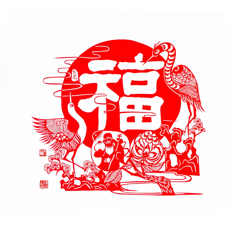 《康寿•福》 剪纸创作包含老寿星、仙鹤、寿桃、万年青等元素,寓意福寿绵长