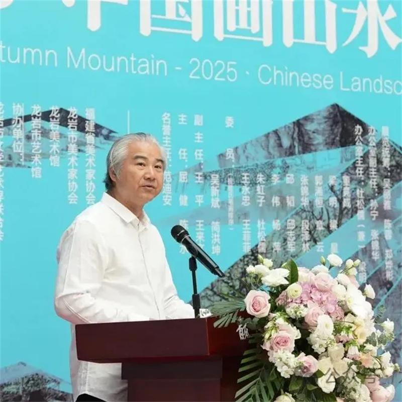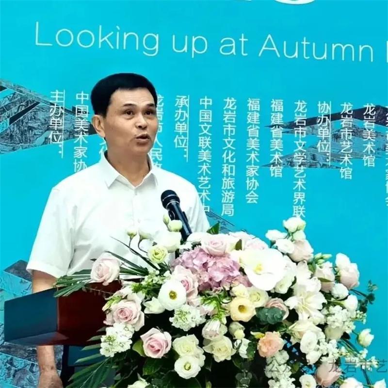 中国美术家协会副主席,福建省文联党组成员、副主席、书记处书记,福建省美协主席王来文致辞,他表示“仰望秋岳”不仅是今人对以华嵒(秋岳)为代表的先贤大师艺术成就的深切缅怀与崇高致敬,也是今人站在巨人肩膀上对艺术高峰的深情仰望,更是对未来中国山水画艺术发展路径的深邃思考与美好展望。
