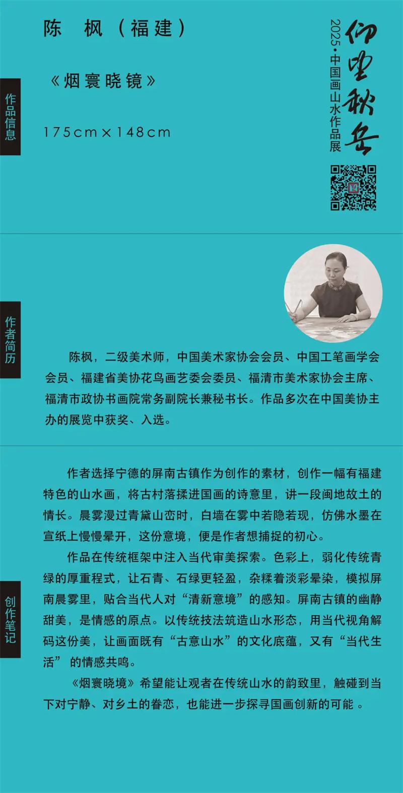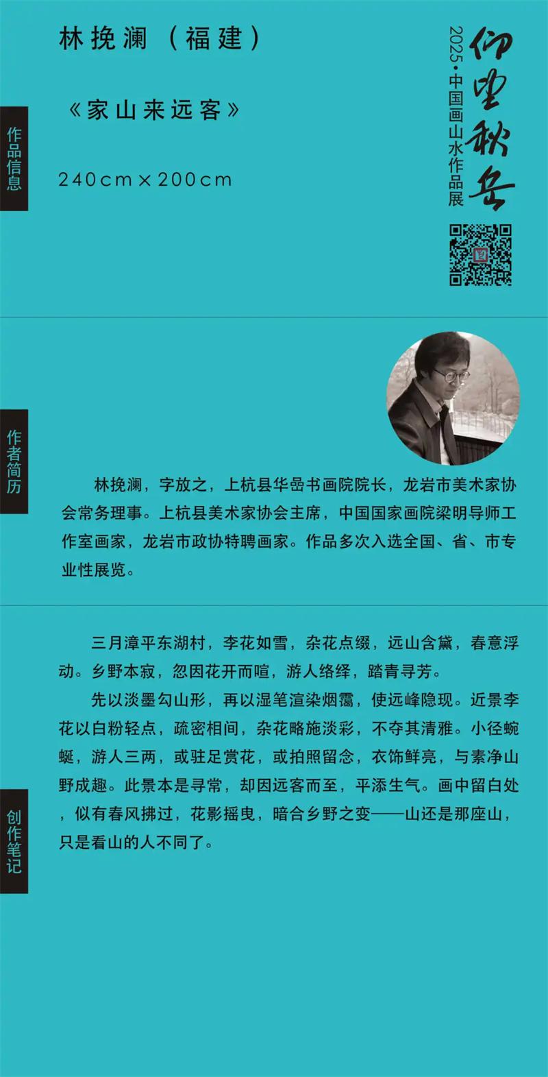为助力新时代文明实践活动不断深入开展,探索当代中国山水画的艺术演进,推出彰显中国精神、民族气派的美术作品,中国美术家协会、福建省文化和旅游厅、福建省文学艺术界联合会、龙岩市人民政府共同主办“仰望秋岳”2025·中国画山水作品展。展览面向全国征集作品4200余件,经初评、复评层层遴选,最终120件作品脱颖而出,呈现在观众面前。