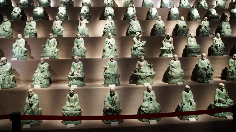 这份殊荣,源于一团泥土与千年窑火的涅槃重生。陈万龙大师出身五代制瓷世家,深研青瓷三十余载,以近乎痴迷的执着,循着宋元古窑的基因密码,复原“翠色天成”之妙釉,融合莆仙深厚的神佛造像传统与人文精神,终成此气象宏大、法相庄严的五百罗汉群像。五百尊罗汉,尊尊形态各异,或怒目降魔,或低眉慈悲,或诙谐自在,平均高45厘米,最高达63厘米,栩栩如生,尽显方寸瓷胎间的宇宙万象与东方智慧,是技艺、艺术与禅意的完美融合。