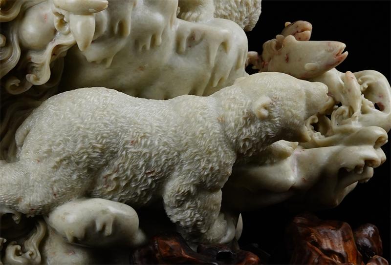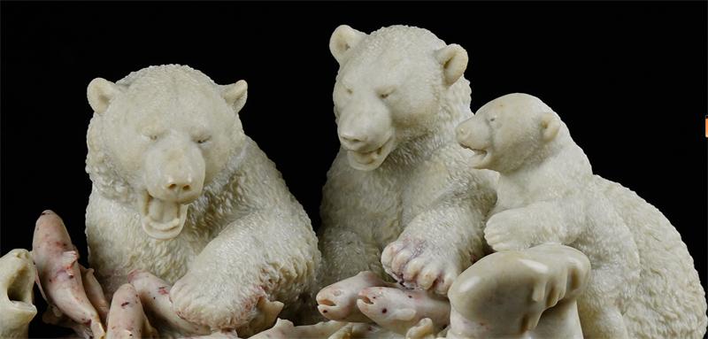 作林亨云大师作品以写实、生动、富有生命力著称。他大胆突破传统石雕技法的固有框架,凭借着深厚扎实的艺术功底,巧妙借鉴木刻技法之精髓。他以细腻且富有变化的刀法,如同一位细心的画师在画布上勾勒线条一般,对每一根毛发的形态、走向和层次都进行了精雕细琢,熊的毛发仿佛被赋予了生命,栩栩如生地展现在世人眼前,仿佛具有鲜活的生命力在微微跃动。观者驻足欣赏时,能真切地感受到北极熊毛发的柔软与蓬松,仿佛触手可及。