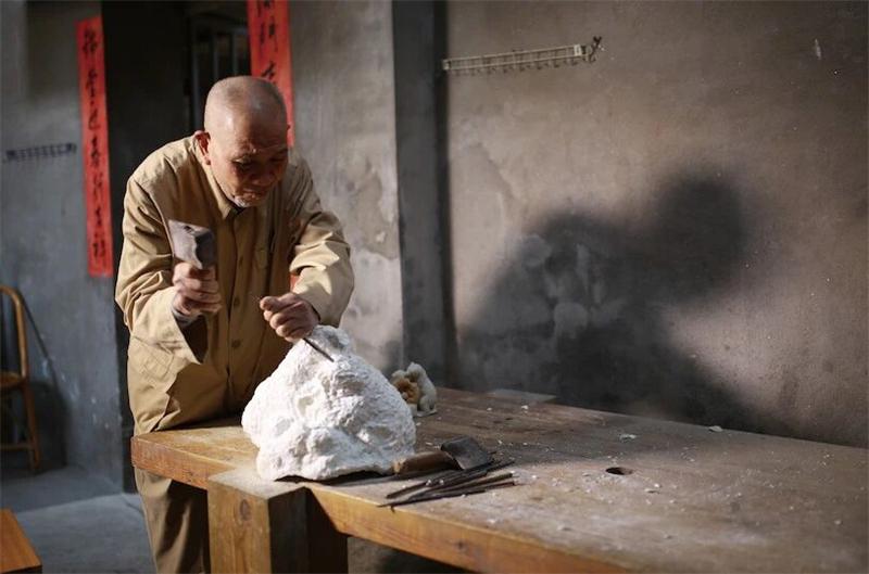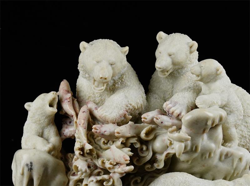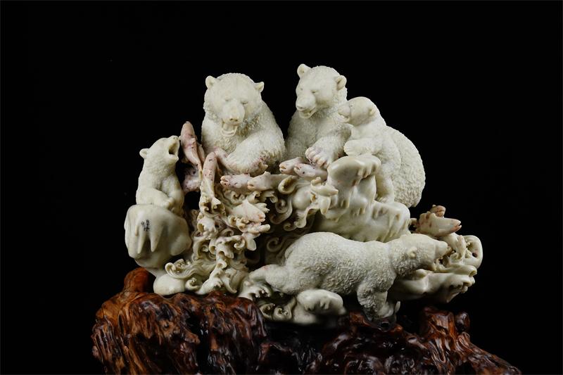 在石材选择上,林亨云独具慧眼地选用了常被忽视的寿山焓红石来创作《群熊》。寿山石色彩丰富,而白色北极熊的雕刻对石材要求极高,纯白的寿山石又过于通透,难以完美呈现北极熊的形象。直到寿山乡挖出焓红石,这种石头虽容易断裂、缺乏光泽,看似并不适合雕刻,但林亨云却发现了它的独特优势——其质地与色泽能够很好地契合北极熊的形象塑造。