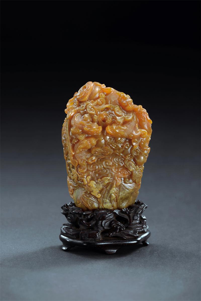作者在创作其他作品时时常以镂空技法化解石材筋格,达成“化瑕为瑜”的艺术效果。通过精细入微的雕琢,螭虎身躯和尾部伸屈自然流畅,指爪充满力量感,仿佛随时腾空而起,彰显其对雕刻艺术的极致追求。