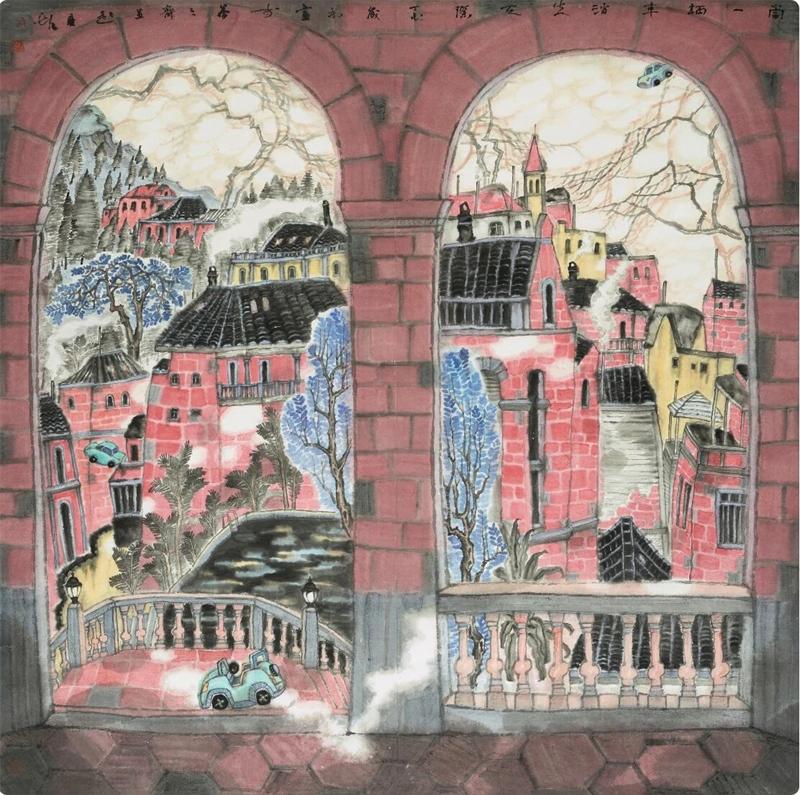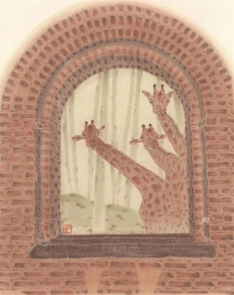 贾淦清 中国画《建筑与动物的共鸣》35x27cm