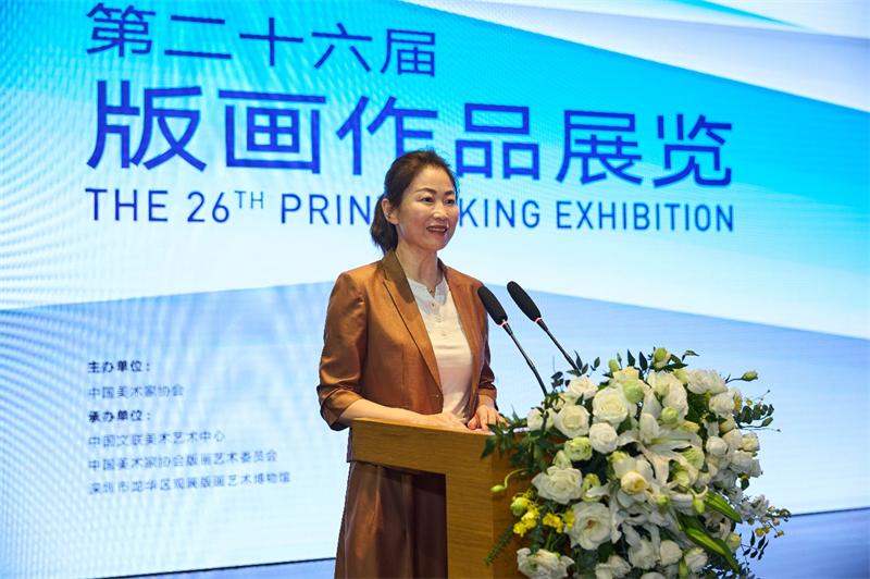 中国美术家协会副主席、广东省美术家协会主席、广州美术学院党委书记、教授林蓝以视频形式致辞。她表示,本届展览作品题材丰富、版种多样,既有对现实的深切观照,也有对艺术语言的积极探索,充分展现了新时代中国版画的创新活力与精神气象。相信这次展览能激励广大艺术工作者们更好地贯彻“两创”方针,推动中国版画不断焕发新的生机,为建设社会主义文化强国贡献美术力量。