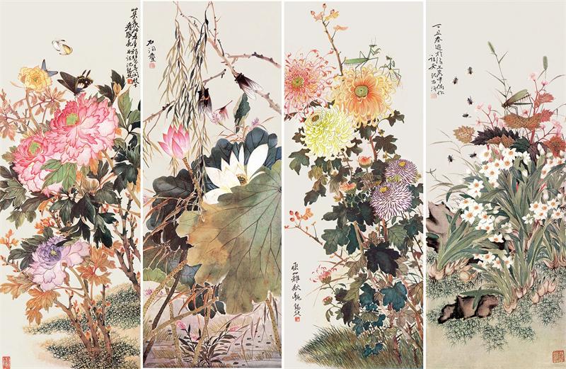 沈锡纯 四季图 153×44cm×4 纸本设色