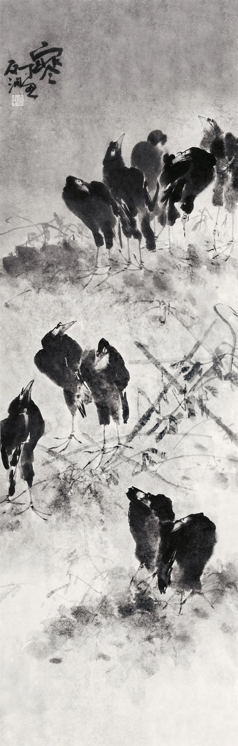 沈锡纯此时期的代表作《寒》,通过墨色浓淡的微观调控让寒冽之意沁入观者之心,众鸟之动态惟妙惟肖;而《四季图》四条屏,则通过墨与藤黄、石绿、胭脂、朱砂的互补色对比,将海派设色语汇与岭南撞彩技法熔铸为具有表现主义特质的色彩结构,没骨工写,工笔意写。1936年,沈锡纯创作的《虎啸岩回溯》更显其技法的成熟:虎躯以篆籀笔法勾勒筋骨,松树山石则融入山水皴法,背景留白处蕴含着道家“知白守黑”的哲学智慧。这种跨题材、跨技法的整合能力,印证了其“传统基因重组”的创新路径。该阶段艺术实践的本质,乃是将地域画派传统置于现代艺术教育的“实验室”中,通过技法的融合探索,实现文人画价值内核的当代存续。