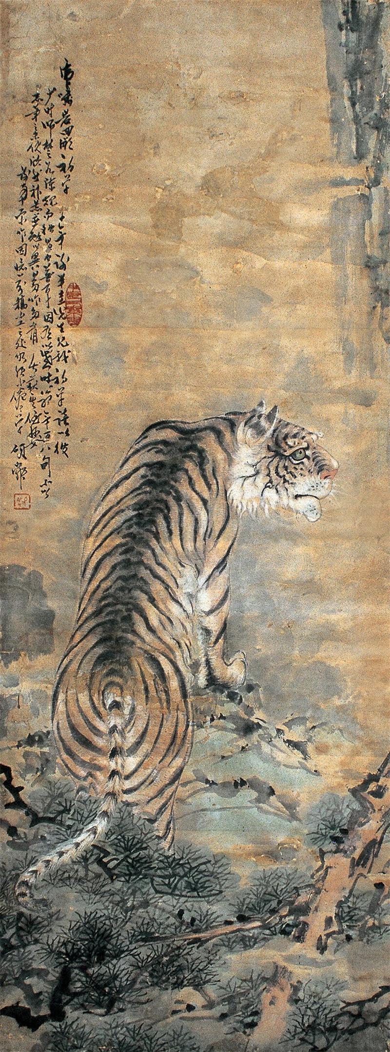 张善孖“气吞万里”的虎图腾塑造,延续了晚清碑学运动“尚力”的美学传统,其笔触中的方折顿挫实为救亡图存心理的视觉投射。沈氏画虎从学于张氏,又能脱张氏而出,其《英风浩气》《慈怀浩气》,通过圆转笔致与温暖色调,将儒家“仁”学理念注入现代族群想象,写出了虎性人情。老虎题材是沈锡纯一生喜爱的题材,成为其代表作。