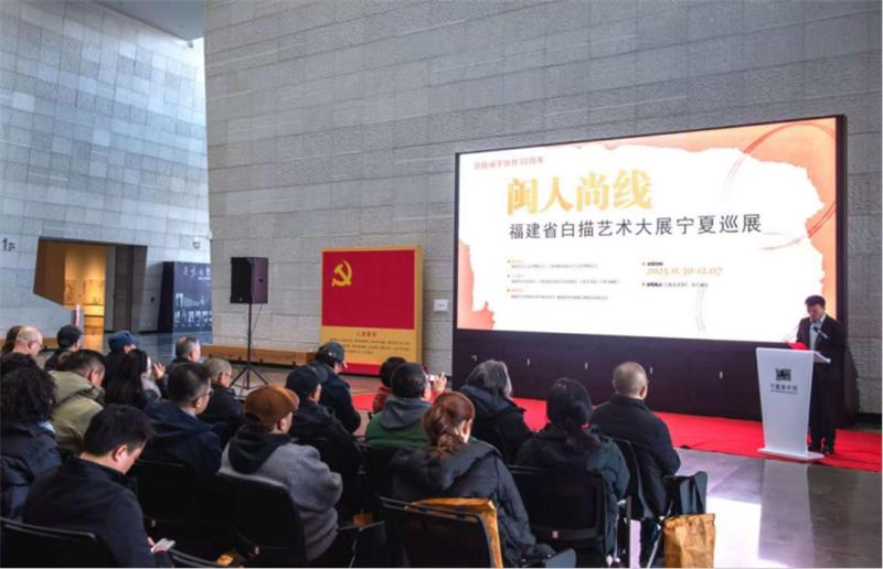 宁夏文联党组成员、副主席陈晓军表示,“闽人尚线——福建省白描艺术大展宁夏巡展”跨越山海,在塞上江南宁夏启幕。这既是一场传承千年的白描艺术盛宴,也是闽宁两地以艺为桥、深化协作的生动实践,闽宁相知,山海情深。自闽宁协作启动以来,两地跨越地域阻隔,在经济帮扶、民生改善、文化交融等诸多领域结下了深厚情谊。文化是连接心灵的桥梁,艺术是传递情谊的纽带。此次白描艺术巡展,正是闽宁文化交流的生动实践——让福建的笔墨雅韵与宁夏的塞上豪情相遇,让传统艺术在东西部交融中焕发新的生机。