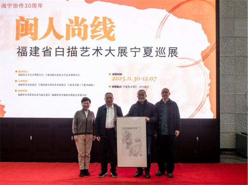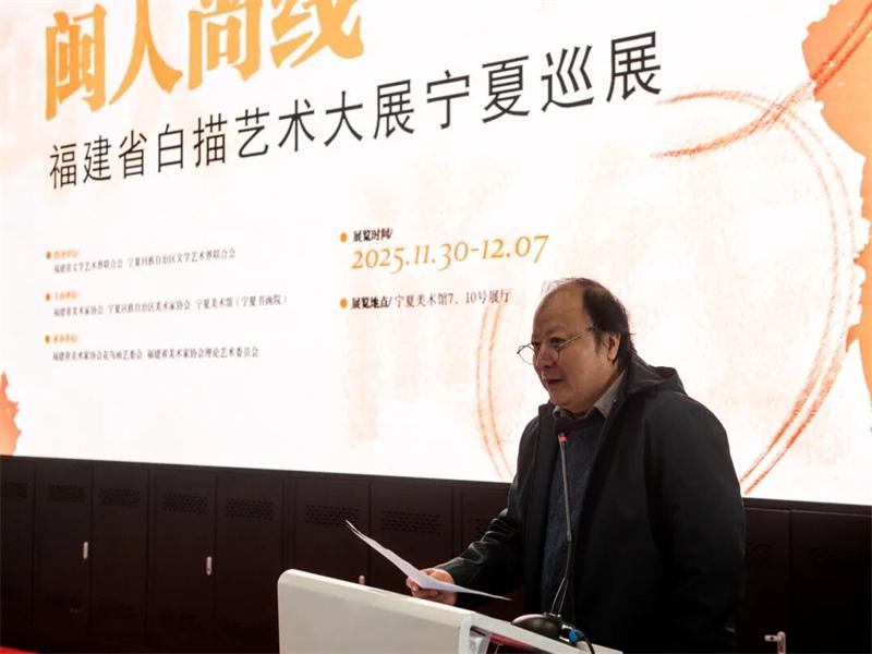 中国美协理事、福建省美协副主席赵胜利在致辞中表示,闽宁协作即将走过三十载不平凡的历程。30年来,两省区携手并进,从脱贫攻坚到乡村振兴,从经济合作到人文交流,共同谱写了携手发展的壮丽篇章。中国白描艺术源远流长,福建更是白描艺术的重镇,曾鲸、吴彬、上官周、黄慎、李耕、黄曦、陈子奋、郑乃珖等名家辈出,福建艺术家们扎根传统,守正创新,以精湛的技艺和深厚的修养,让这一古老艺术形式绽放出时代光彩。此次宁夏巡展是福建美术界为闽宁协作三十年的一份独特贺礼,更是闽宁协作向更深层次、更宽领域拓展的体现,祝愿两省美术界的友谊之花在新时代绽放得更加绚丽夺目。
