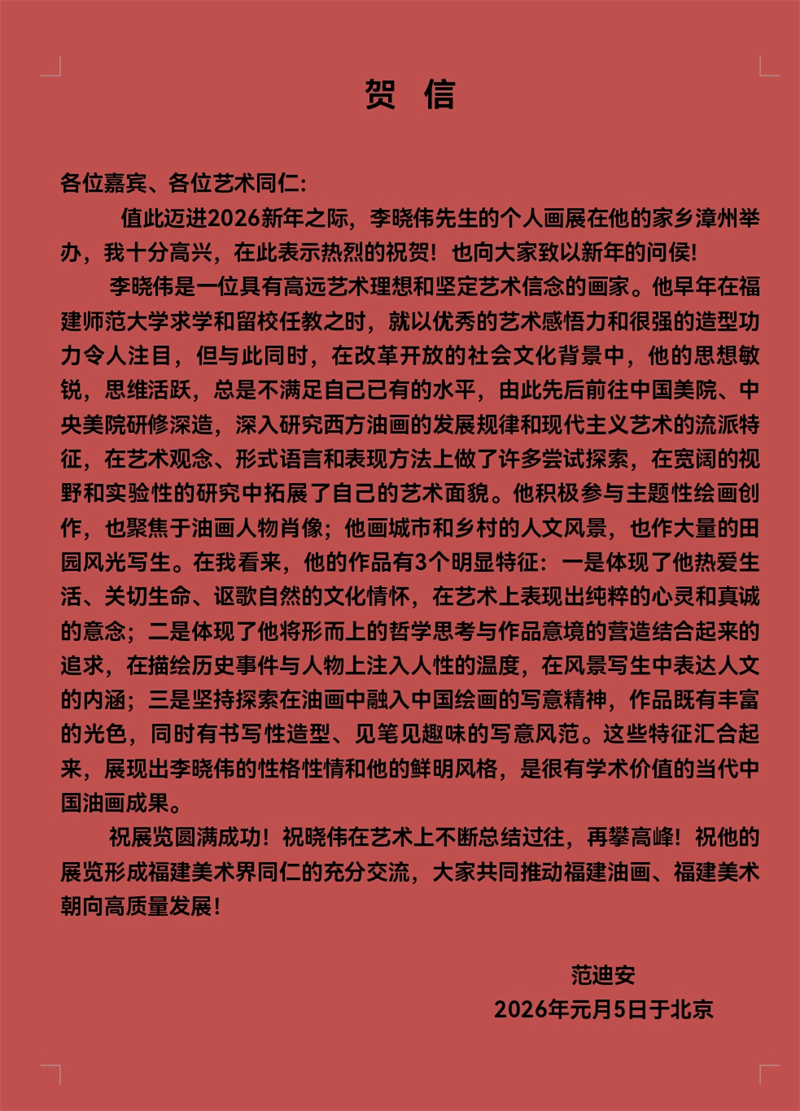中国美术家协会主席范迪安先生为本次展览特致贺信,热烈祝贺李晓伟个人画展于其故乡漳州启幕。梁星在开幕式上宣读贺信。
